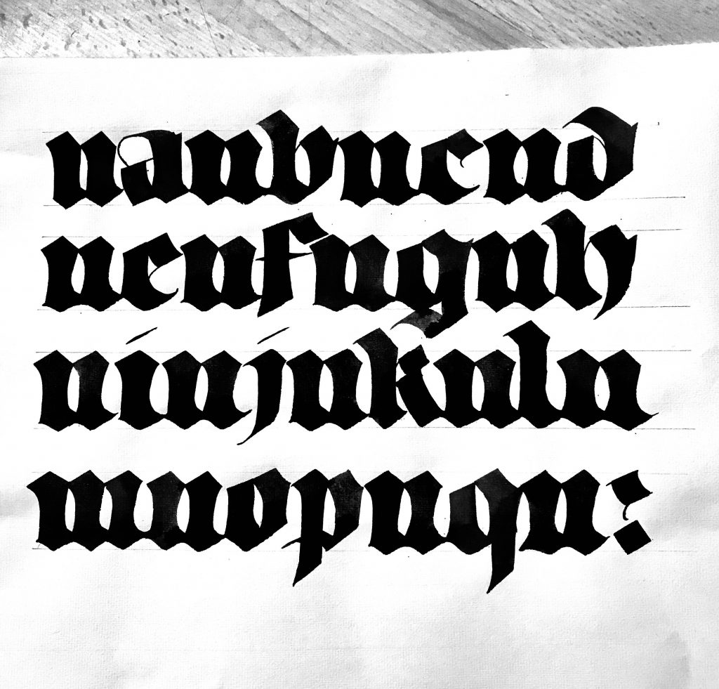 Pensez aussi à travailler dans une autre langue, comme l’anglais qui regorge de combinaisons de lettres (GH, TH, WH…) très intéressantes à traiter en calligraphie.