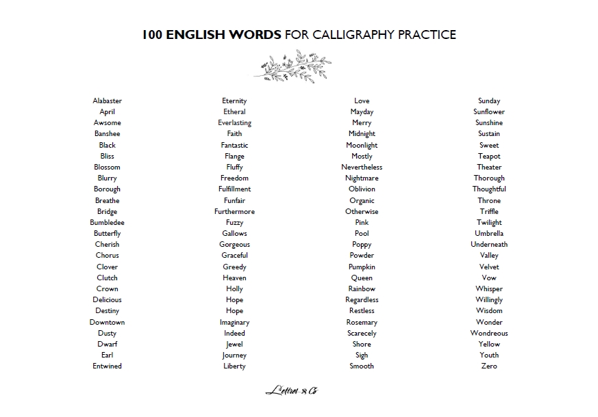 J’en profite pour vous donner en téléchargement une liste de 100 mots en anglais pour s’entraîner à la calligraphie, en plus de la liste de 77 mots inspirants déjà disponible sur le blog !