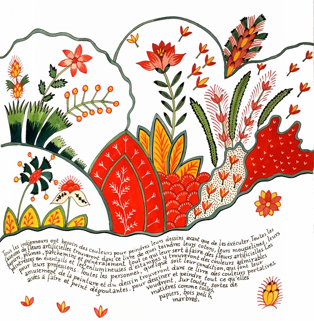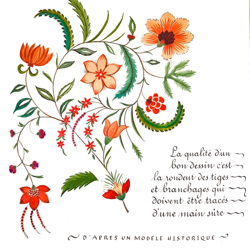 Le musée de la toile de Jouy retrace l’histoire des « indiennages », l’évolution de motifs – initialement copiés des motifs indiens – et des procédés de fabrication. Lors de la visite, j’ai été absolument séduite par l’inventivité et la créativité de ces motifs fleuris. J’ai donc pas mal dessiné et exploré ce style, et je me suis dit que cela vous intéresserait peut-être, vous aussi, de vous lancer dans ces dessins de fleurs stylisées aux possibilités multiples.