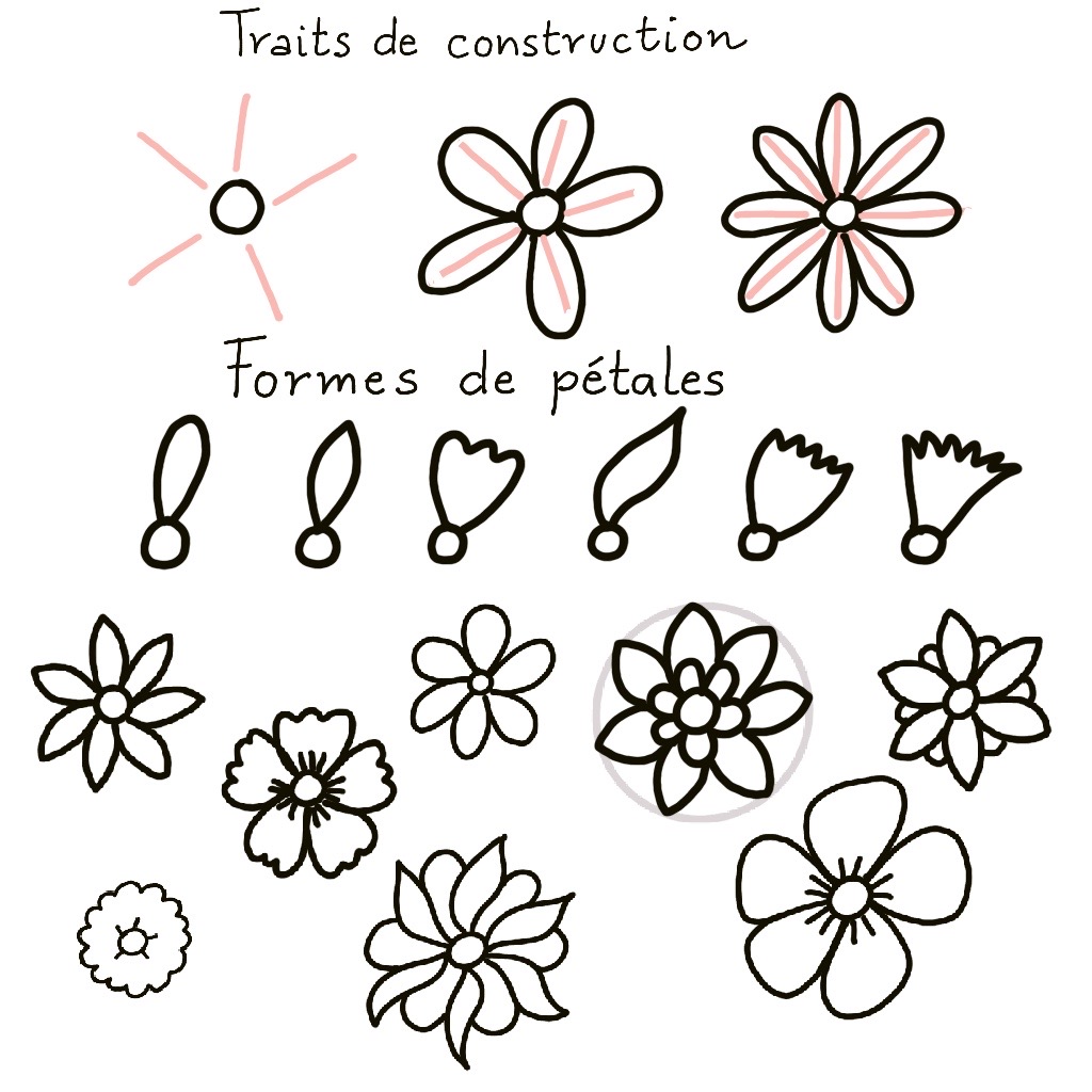 Pour la structure de base, on choisira un point de départ : un rond pour commencer, qui figurera le coeur de la fleur. Pour dessiner les pétales, on peut esquisser des lignes directrices, afin de bien les répartir. Rien qu’avec ce modèle de base, on peut essayer différentes formes de pétales : ovales simples, en S, crantés, rond, etc.