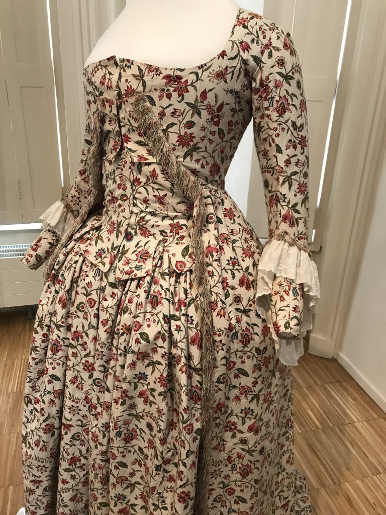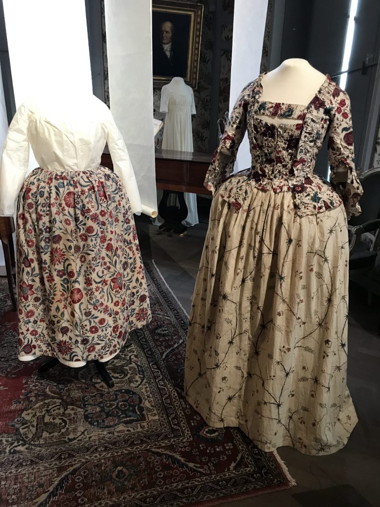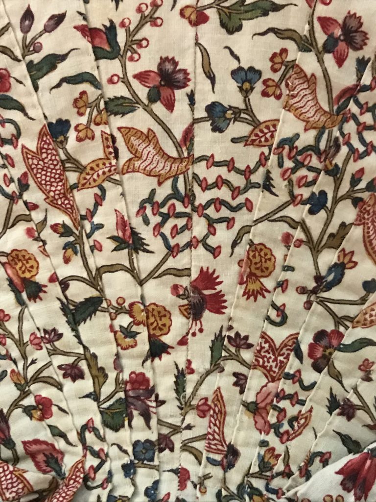 Début mars, je vous avais parlé de mon immersion dans le XVIIIème siècle, dans un article consacré la Ronde. C’est après avoir suivi un cours en ligne sur les motifs de Toile de Jouy que j’ai voulu approfondir mes connaissances sur les motifs typiques des toiles de coton très en vogue au XVIIIème siècle, que l’on appelait les « indiennes ». Ces tissus imprimés ont révolutionné non seulement la mode, mais aussi toute l’industrie textile en Europe. Longtemps interdits en France, à cause de la concurrence faite aux fabricants de laine et de soie, leur fabrication fut finalement autorisée et de nombreuses fabriques d’indiennes virent le jour, notamment à Mulhouse, Marseille et à Jouy-en-Josas avec la célèbre fabrique Oberkampf.