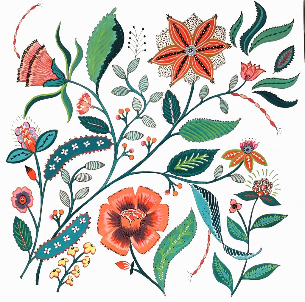 Pour moi, dessiner des motifs fleuris est une pause plaisir, très relaxante. Je ne sais jamais à l’avance où je vais, je pars de quelques grands traits de contruction – les branchages principaux – que j’agrémente au fur et à mesure.