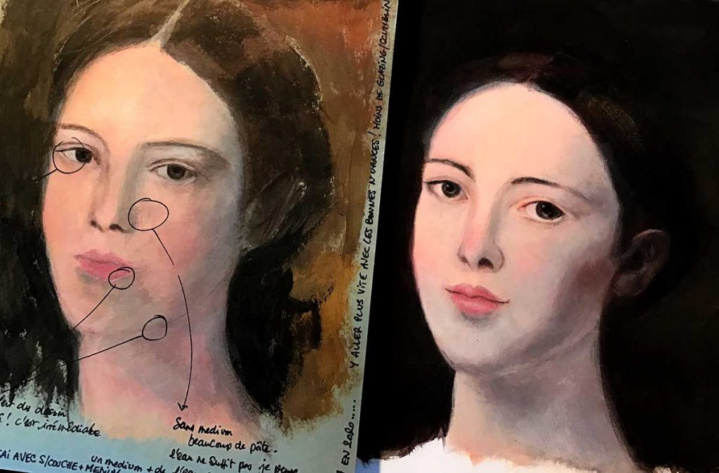 C’est en écrivant mon e-book sur la gouache que j’ai eu envie de travailler des illustrations moins enfantines, en recherchant davantage la lumière et les volumes. Ou alors, c’est en travaillant les volumes à la gouache que j’ai décidé de consigner mes recherches dans un e-book… je ne sais plus. J’ai donc peint un peu à la gouache. Après un séjour dans le Lubéron, durant lequel j’ai craqué pour des pigments, j’ai exploré la tempéra à l’oeuf. Puis sur ces entrefaits, j’ai reçu mon amie Agathe qui m’a fait travailler à l’acrylique (un medium que je détestais, mais avec lequel je sentais que j’avais peut-être des trucs à faire quand même). Bref, de fil en aiguille, j’ai ressorti les pinceaux, compulsé toute une littérature, avalé des tonnes de vidéos et ai travaillé le dessin selon les méthodes académiques du XIXème, fait des dizaines d’essais, etc. Il me reste encore du chemin, mais j’ai commencé à capter pas mal de choses, et j’ai beaucoup appris.
