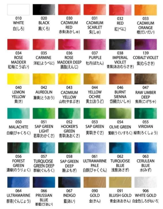 Il y a peu d’information sur la palette Gansai Tambi sur le site japonais de Kuretake, que ce soit au niveau des liants ou des pigments. Néanmoins, Kuretake indique que la formule a été mise au point selon les méthodes traditionnelles. D’où, l’on peut penser qu’il n’y a pas d’additifs synthétiques dans ces aquarelles mais bien les ingrédients naturels de la formule originelle. [J’ai quand même un doute sur les pigments. Dès que j’ai une information je ferai une mise à jour]