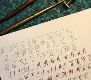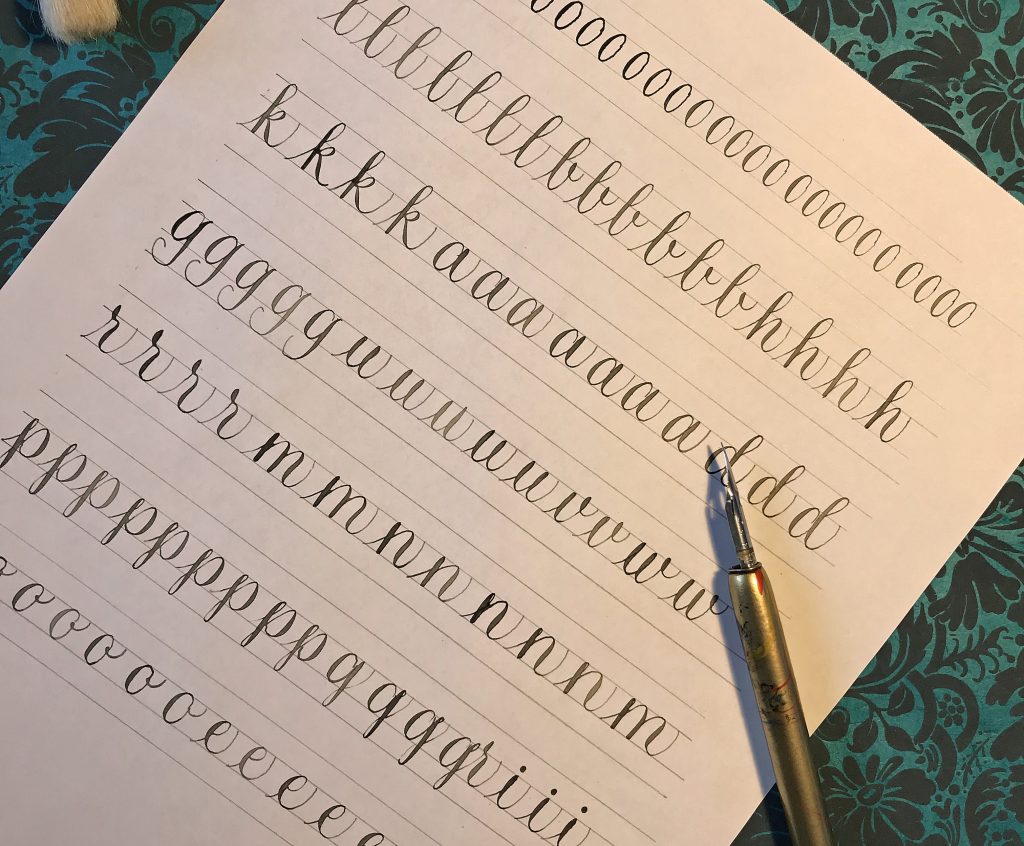 La forme des lettres est différente de celle de l’anglaise, mais vous remarquez bien le contraste entre les pleins (traits gras, faits en descendant) et les déliés (traits fins faits en remontant). L’objectif ici est de bien capter la forme et d’obtenir de la finesse dans le délié.