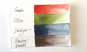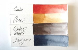 Le point de départ, c’est de connaître vos couleurs : celle qui sort de vos tubes ou godets, pas celle que vous voyez dans un livre ou sur un écran. Il est important que vous fassiez vous-mêmes vos nuanciers, car la couleur réagit en fonction du support que vous utilisez. De plus, les nuanciers des marques, qu’ils soient à l’écran ou imprimés, ne restituent jamais la réalité d’une couleur.