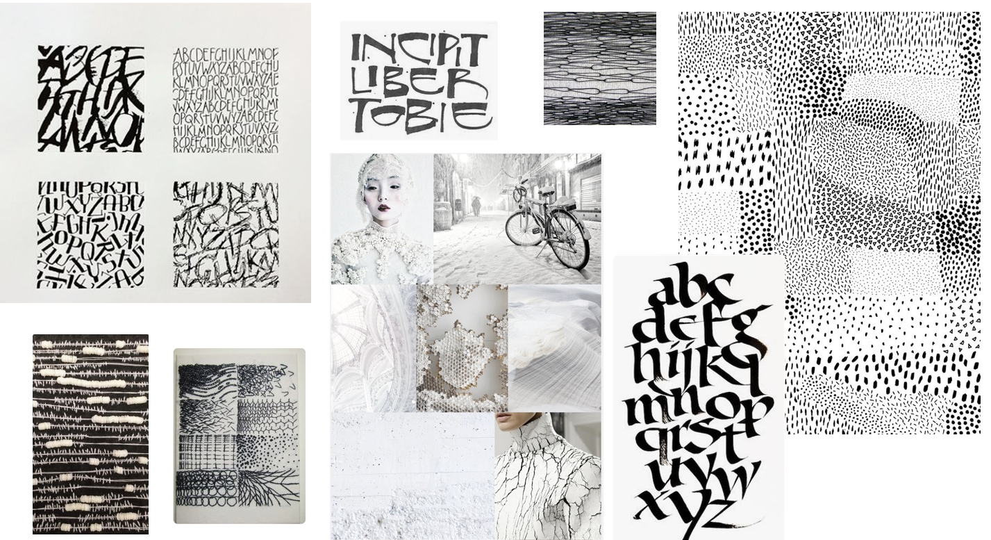 Ce moodboard a été fait pour une future réalisation en calligraphie. On est dans du graphique, du noir et blanc, du rythme et du contraste. Vous voyez qu’il y a de l’écriture, mais pas seulement… il y a des images qui viennent de broderies, des photos, des matières.
