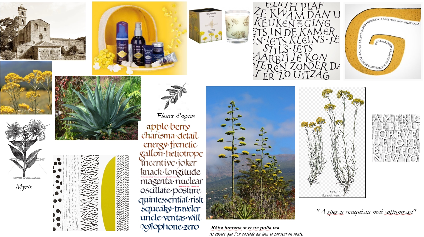 J’avais fait un petit moodbard pour mon carnet de voyage cet été, histoire de rassembler des pistes, des inspirations. J’étais dans l’été, la Corse, les tons citron et bleu, le carnet de voyage.