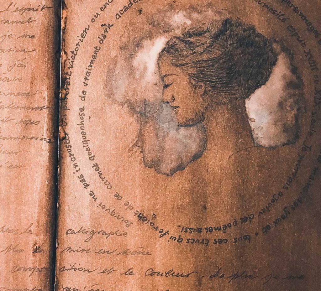 Le mélange écriture, dessin au bic et encre est vraiment intéressant en terme de textures. Le moment où l’encre est appliquée est simplement magique, car il révèle totalement le dessin !