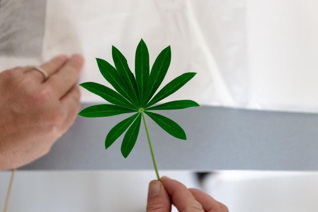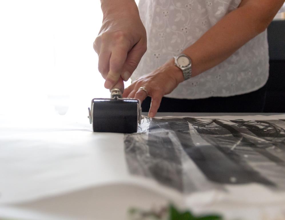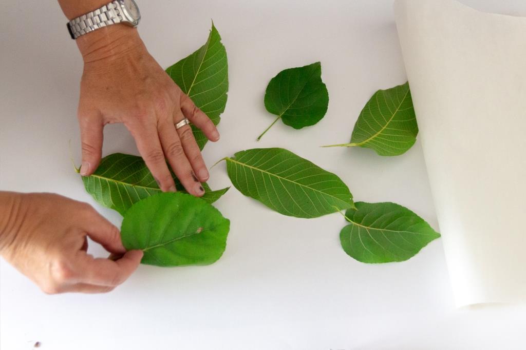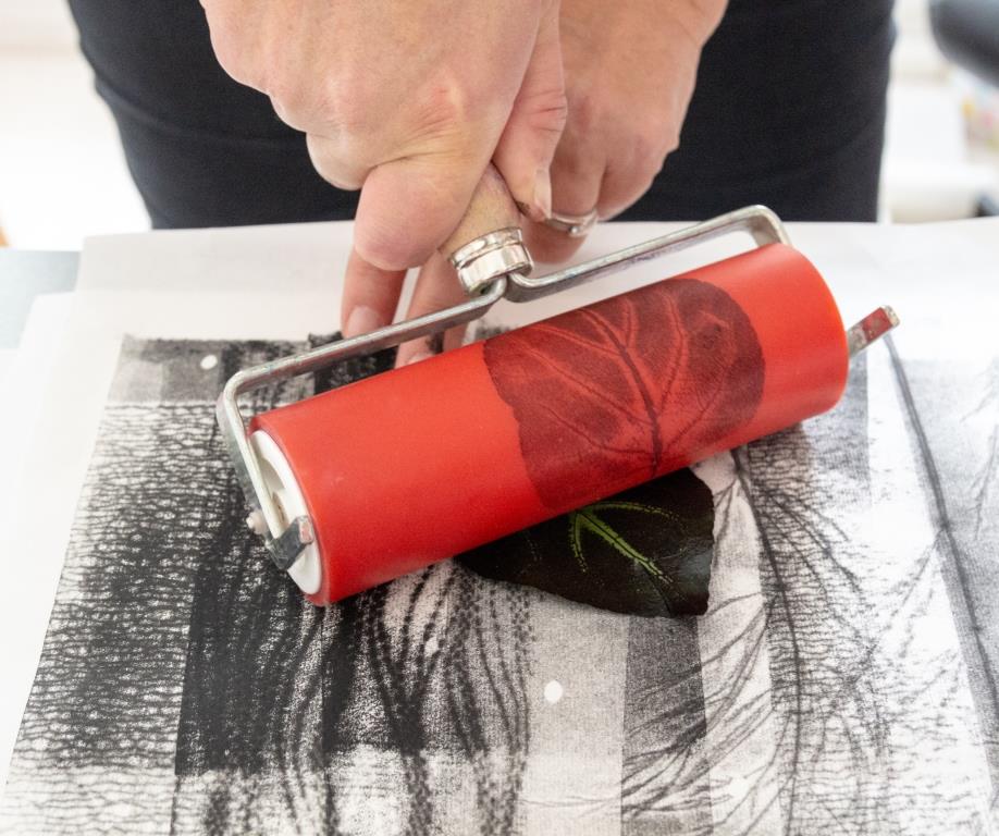 Les feuillages collectés sont disposés sous la feuille, puis le rouleau encré vient imprimer leur trace sur le papier.