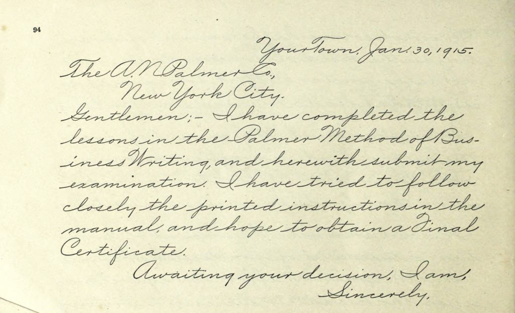 Vers 1890, Austin Norman Palmer édita une méthode d’écriture qui simplifiait encore la Spencerian, avec une méthodologie d’apprentissage privilégiant la posture et le mouvement du bras entier plutôt que le mouvement des doigts et du poignet pour accompagner l’écriture.