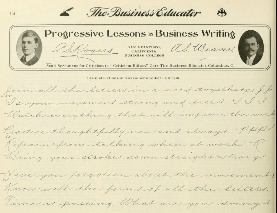 Au début du XIXème siècle, l’écriture enseignée aux Etats-Unis et en Europe était principalement issue de l’Anglaise (ou Copperplate). Avec l’essor de l’industrie et du commerce, les besoins d’écriture pour les affaires se développèrent. Dans les banques, les sociétés de courtage, les assurances, les postes et les industries, la rédaction des contrats, des lettres et la tenue des registres employèrent de nombreuses personnes dont le métier était…d’écrire.