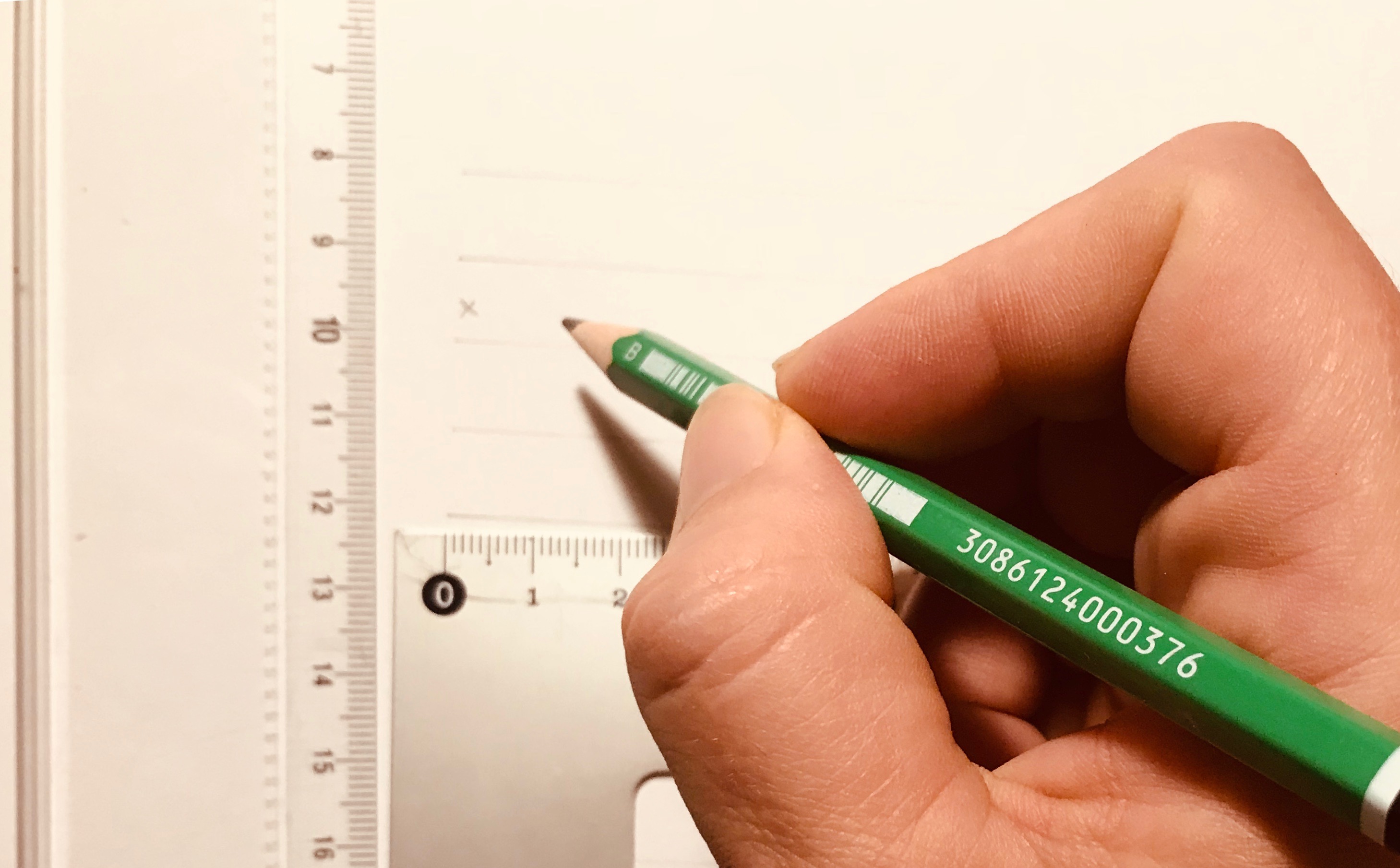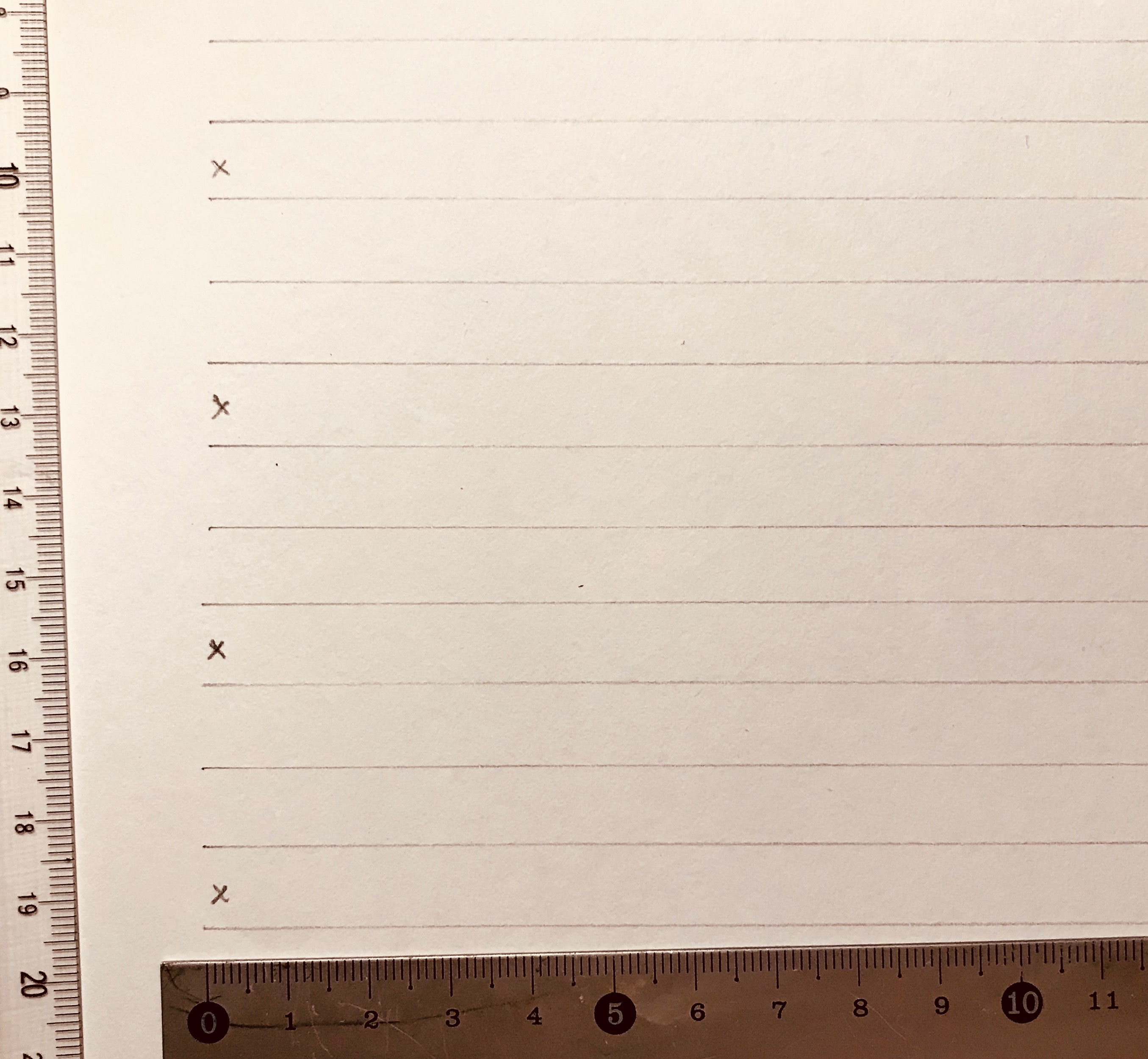 Je trace une petite croix sur les lignes de base de l’écriture, toujours pour mieux me repérer. Essayez d’être léger.e en traçant la portée, afin de ne pas trop marquer le papier.