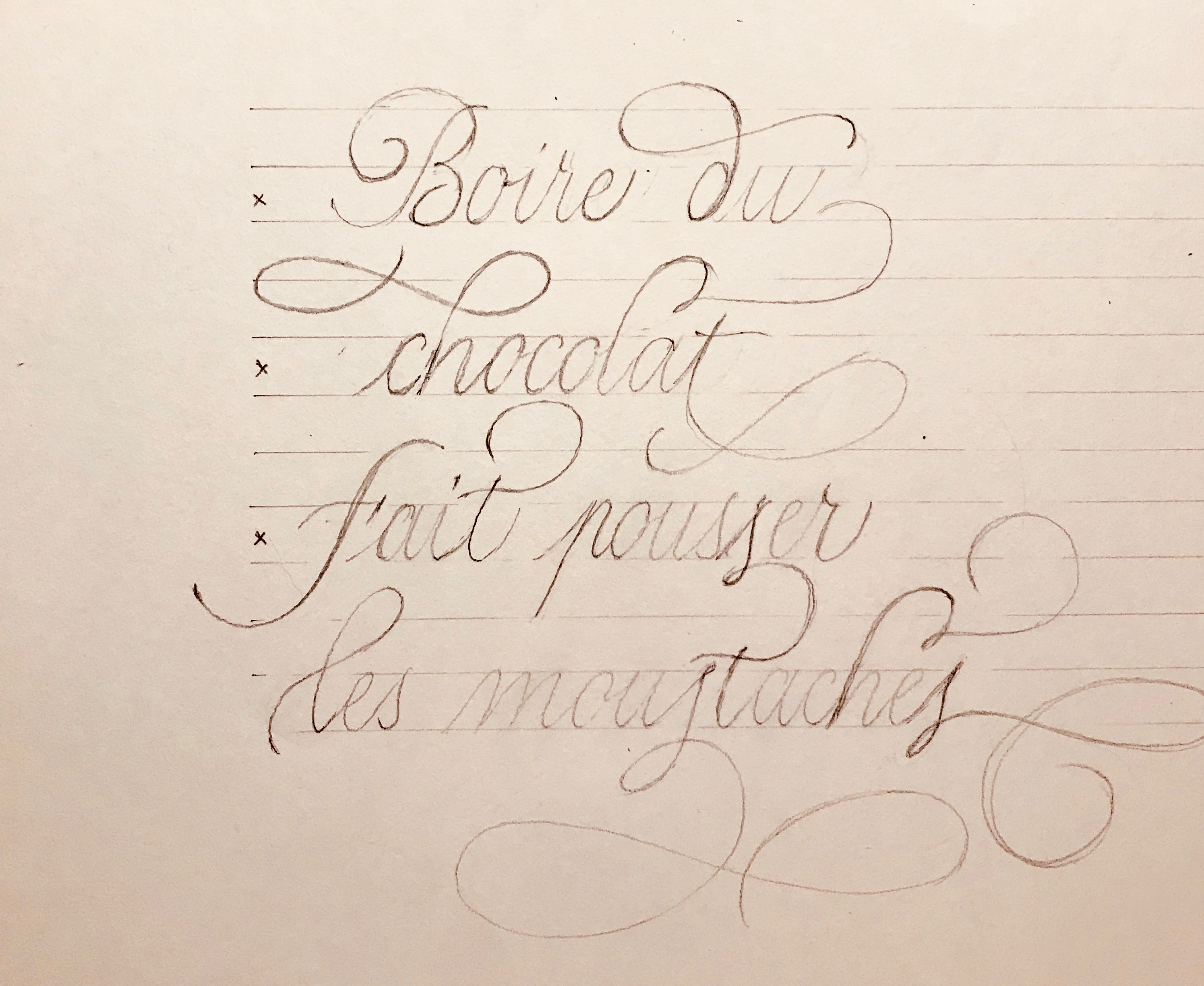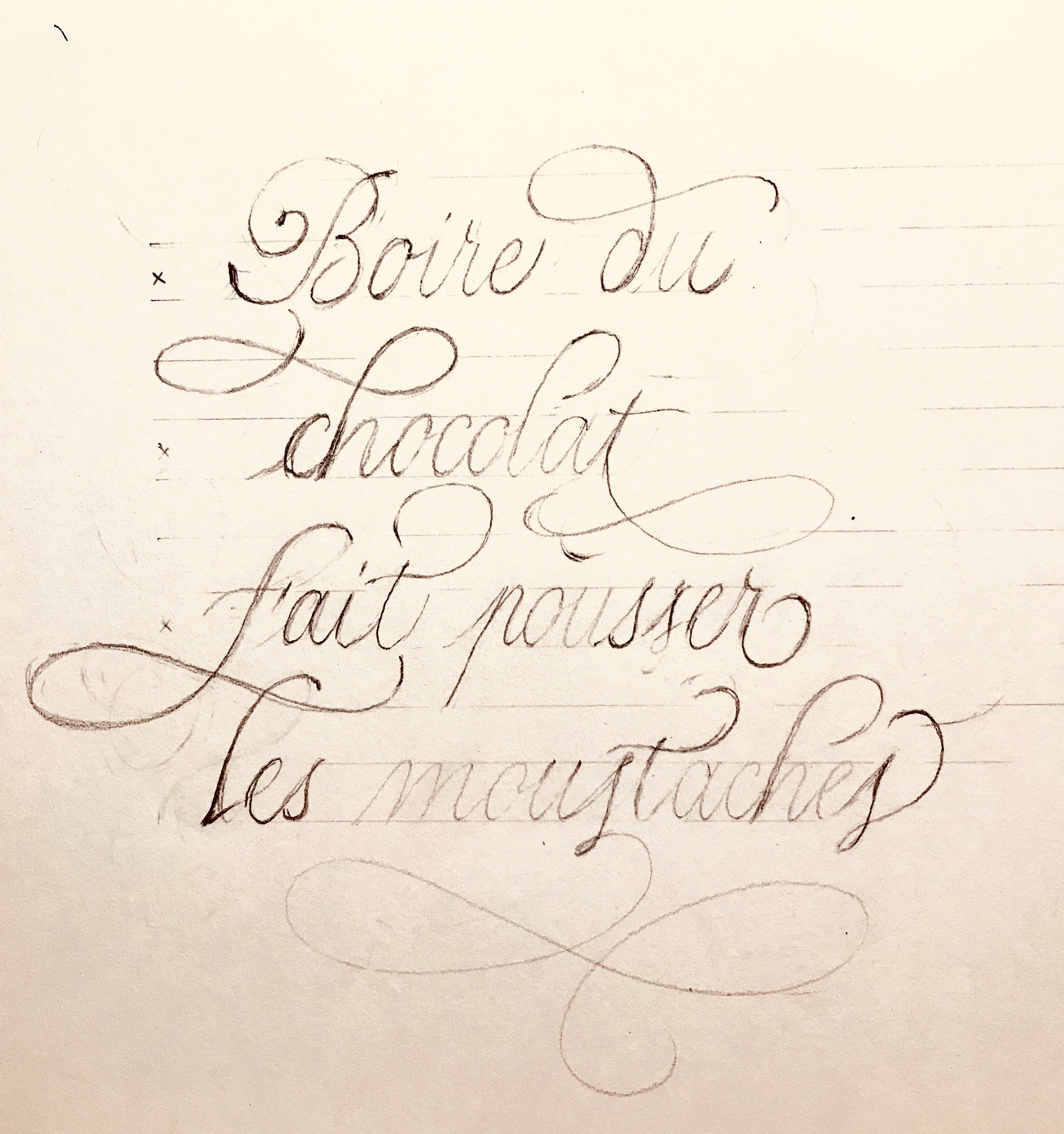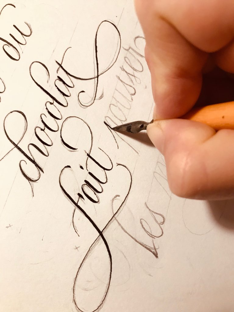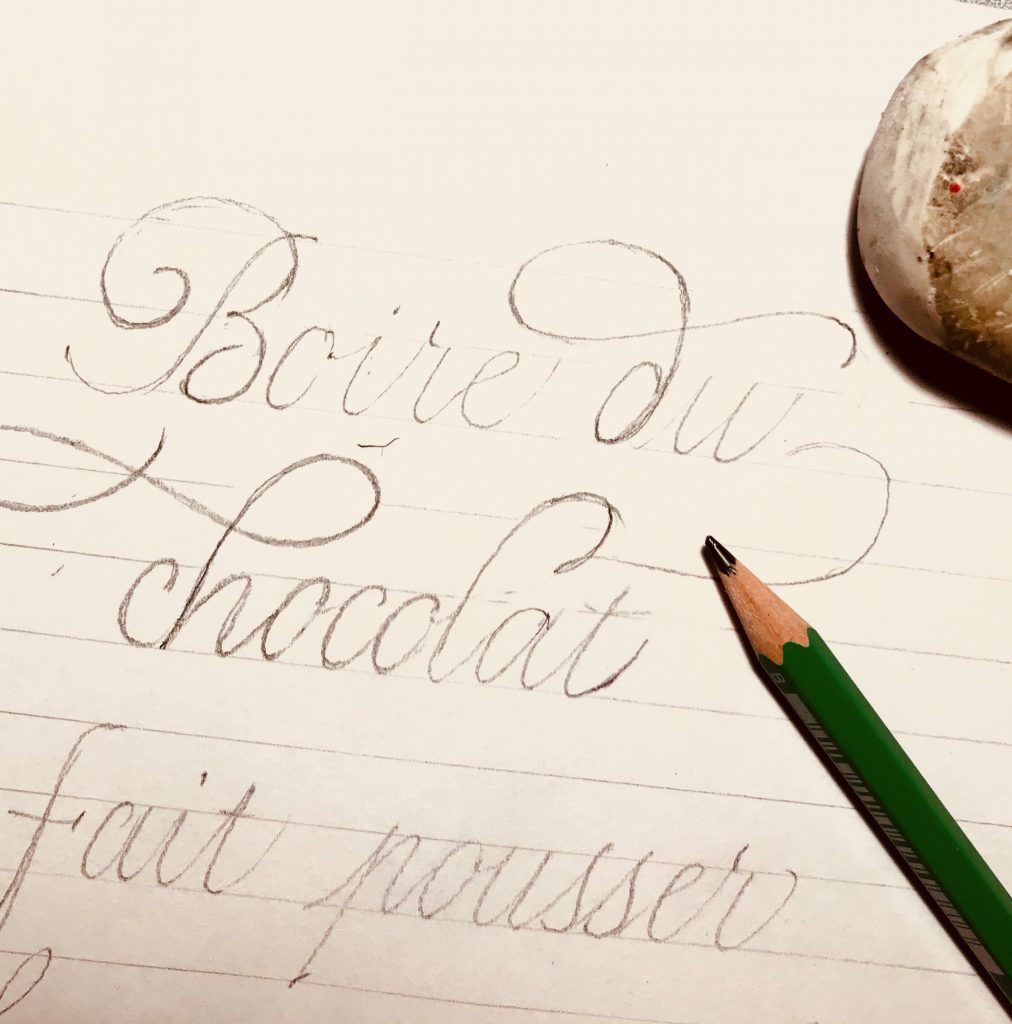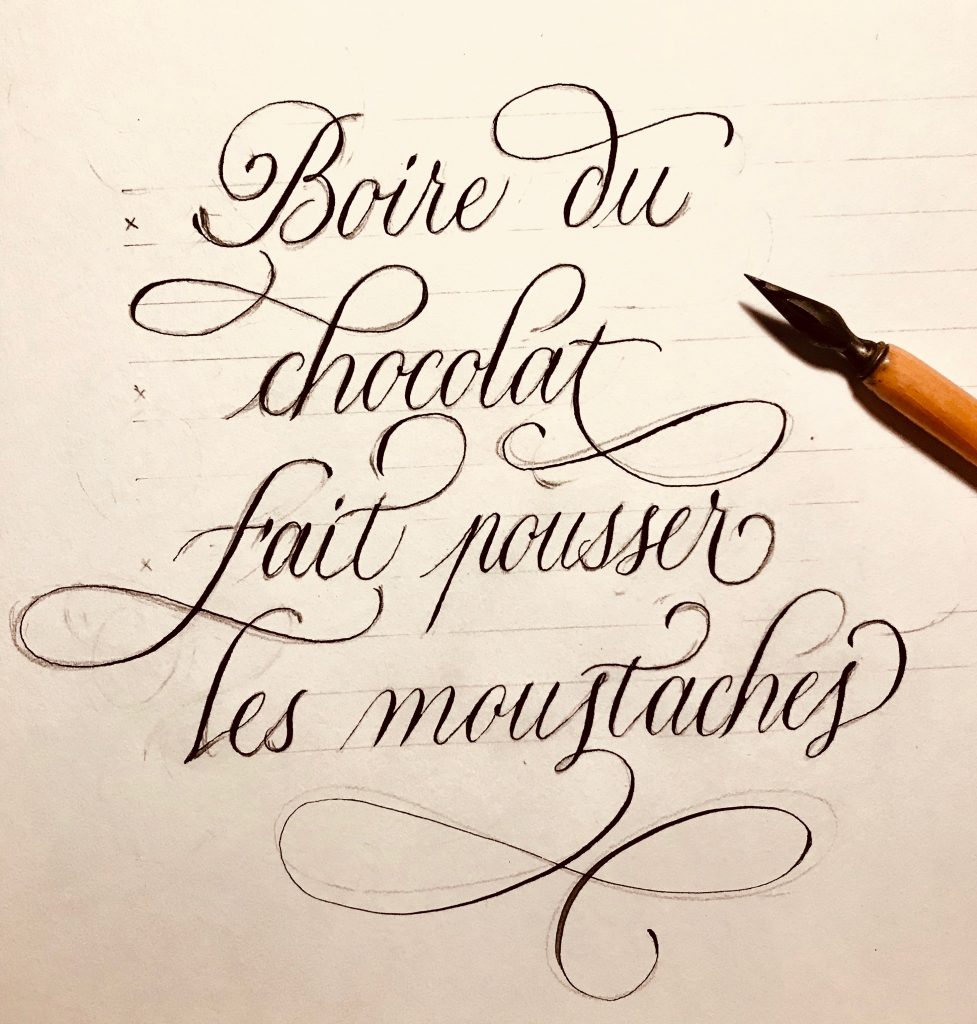 Le texte est rédigé une première fois, sans fioritures (si ce n’est la majuscule), au crayon de papier. Les pleins et les déliés ne sont pas appuyés. L’objectif est ici de dresser la disposition globale du texte et de veiller à un interlettrage équilibré. Vous pouvez retoucher le texte afin qu’il soit correctement ancré (à droite, à gauche ou centré). Ici, je l’ai plutôt centré.
